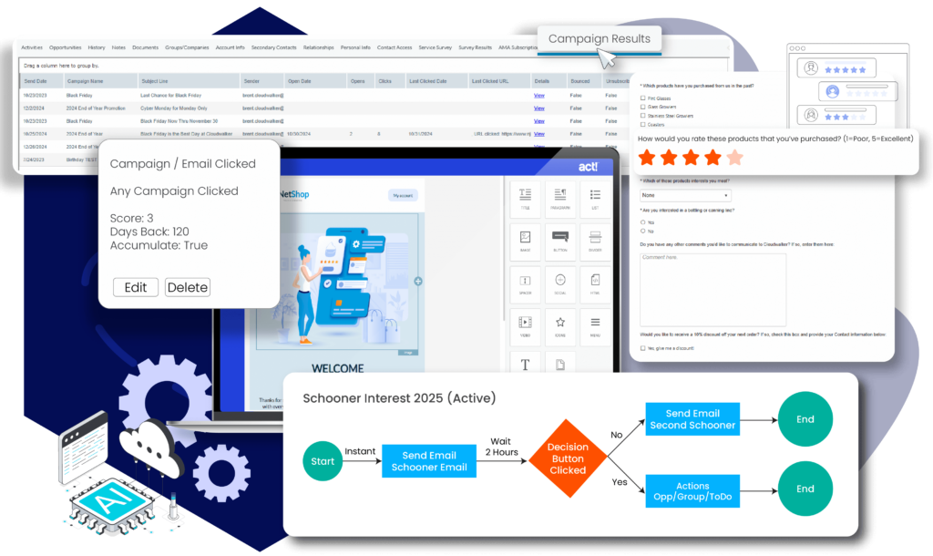Laat Act! het werk doen en stimuleer betrokkenheid bij klanten en prospects. Met Act! Email Marketing Plus ontwerp en automatiseer je resultaatgerichte nurture-campagnes die prospects en klanten via persoonlijke routes begeleiden, op basis van hun interactie met je e-mailcommunicatie. Ontwerp je campagne helemaal zelf of maak gebruik van kant-en-klare campagnes met ingebouwde triggers voor acties. De geïntegreerde AI-schrijfassistent helpt je moeiteloos bij het maken van relevante en overtuigende content, en zorgt voor correcte spelling en grammatica.