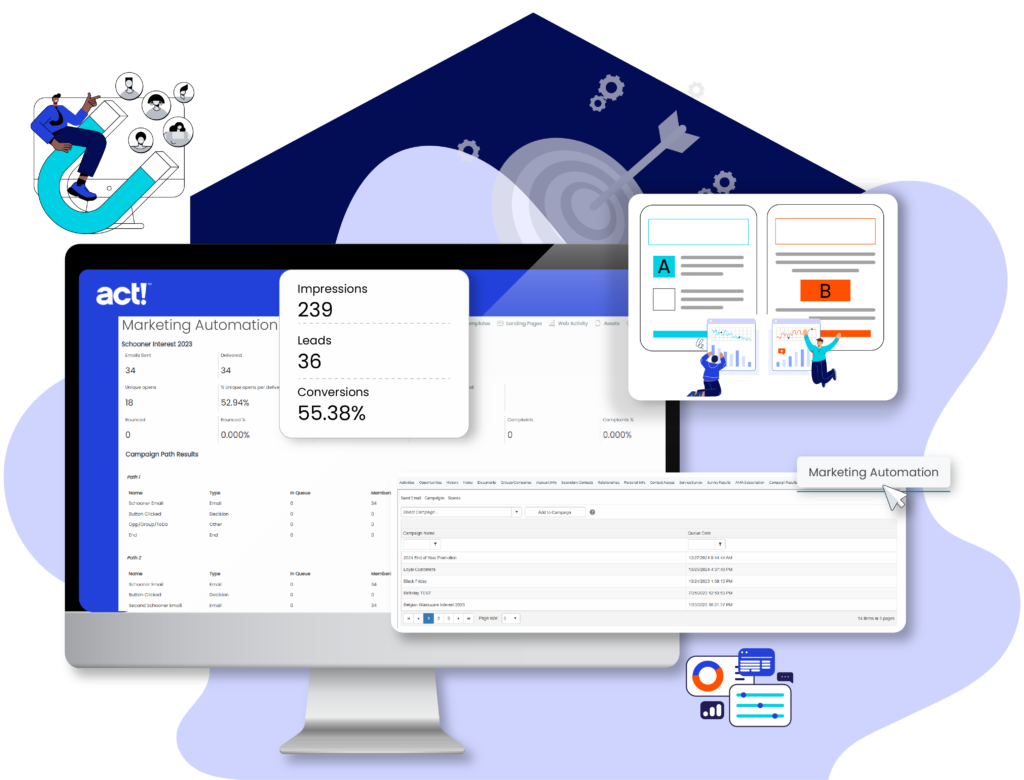 Vergroot je bereik met op maat gemaakte landingspagina’s of plaats formulieren op je website om nieuwe leads vast te leggen. Deel campagnes op sociale media om je zichtbaarheid te vergroten of blijf betrokken met enquêtes en nieuwsbrieven. Nieuwe leads worden automatisch toegevoegd als contactpersoon in Act!, inclusief opvolgactiviteiten – zo speel je direct in op nieuwe kansen.