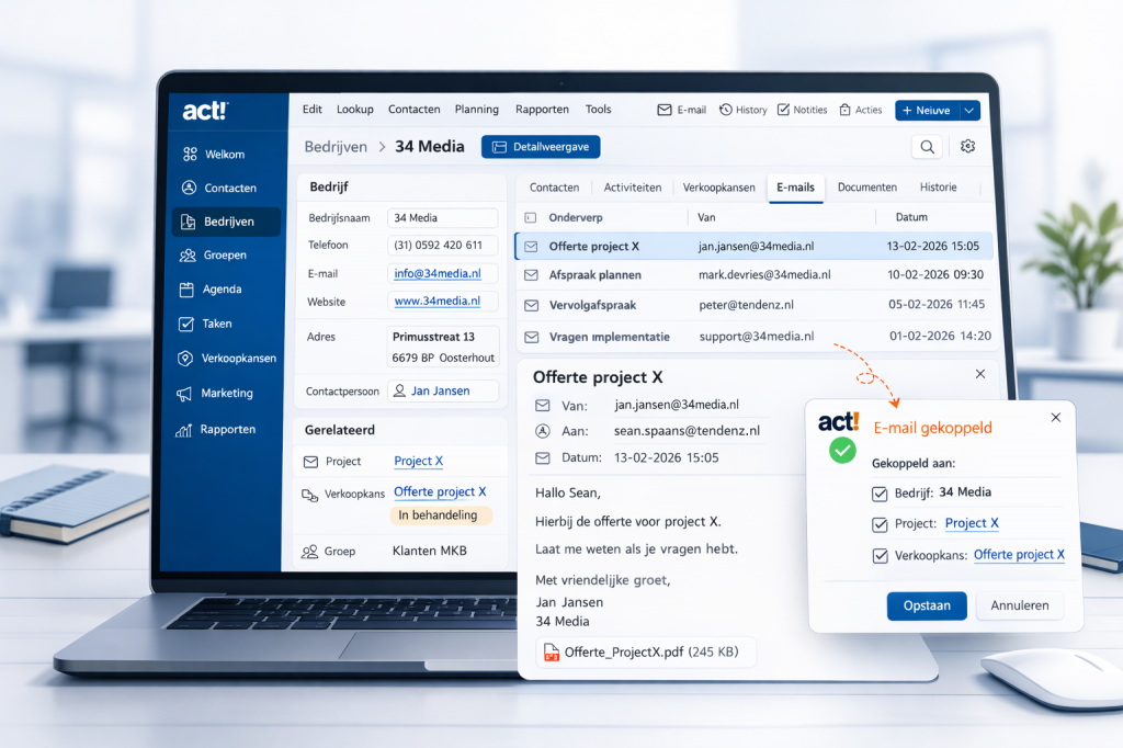E-mail is nog steeds één van de belangrijkste communicatiekanalen. Toch raakt overzicht snel kwijt wanneer berichten alleen in Outlook staan en niet bij je klantinformatie. Met Email2Act! koppel je uitgaande en binnenkomende e-mails vanuit Outlook rechtstreeks aan relaties, bedrijven, verkoopkansen en projecten in Act! CRM. Zo heb je altijd het volledige communicatieoverzicht op één plek.