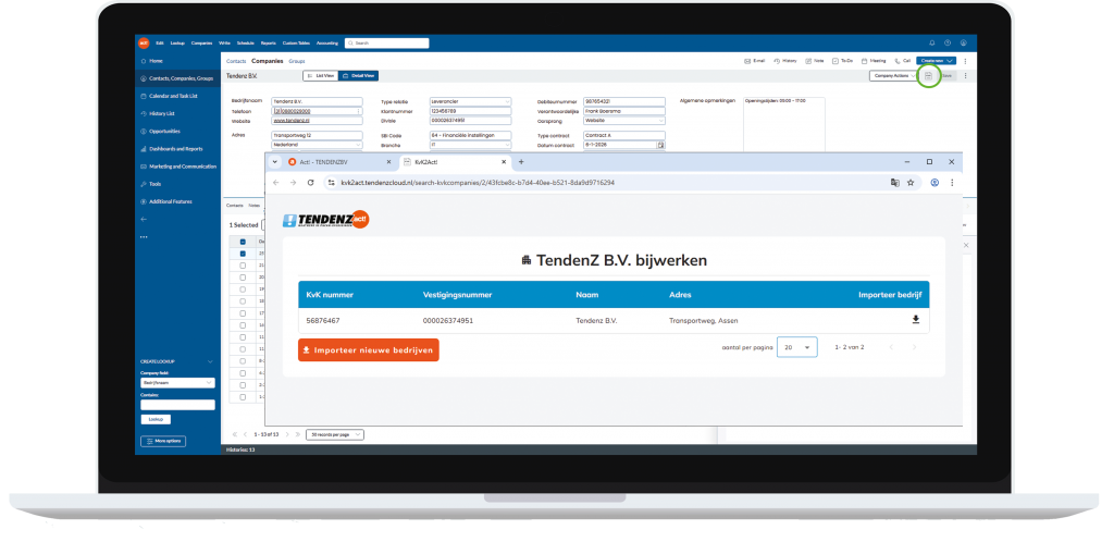 Bedrijfsinformatie overtypen hoeft niet meer. Met de KVK-integratie van TendenZ zoek je rechtstreeks in het Handelsregister vanuit Act! CRM. Zoek op bedrijfsnaam, vestiging of KVK-nummer, kies het juiste bedrijf en voeg het met één klik toe aan je klantbestand, compleet met adres, rechtsvorm, vestigingsnummer en status.
